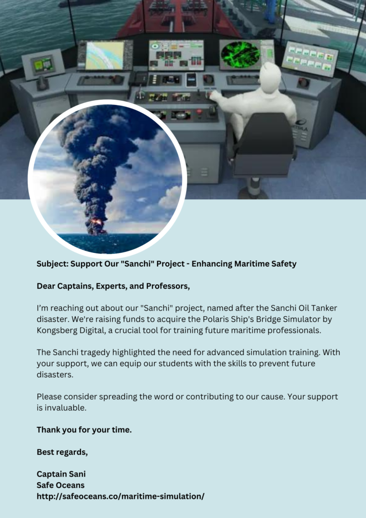Join us in our mission to prevent the next maritime disaster. Together, we can make a significant impact on the future of maritime safety and ensure that the lessons learned from the Sanchi tragedy are not in vain. Your donation, no matter the size, will bring us one step closer to equipping our students with the best training available.
